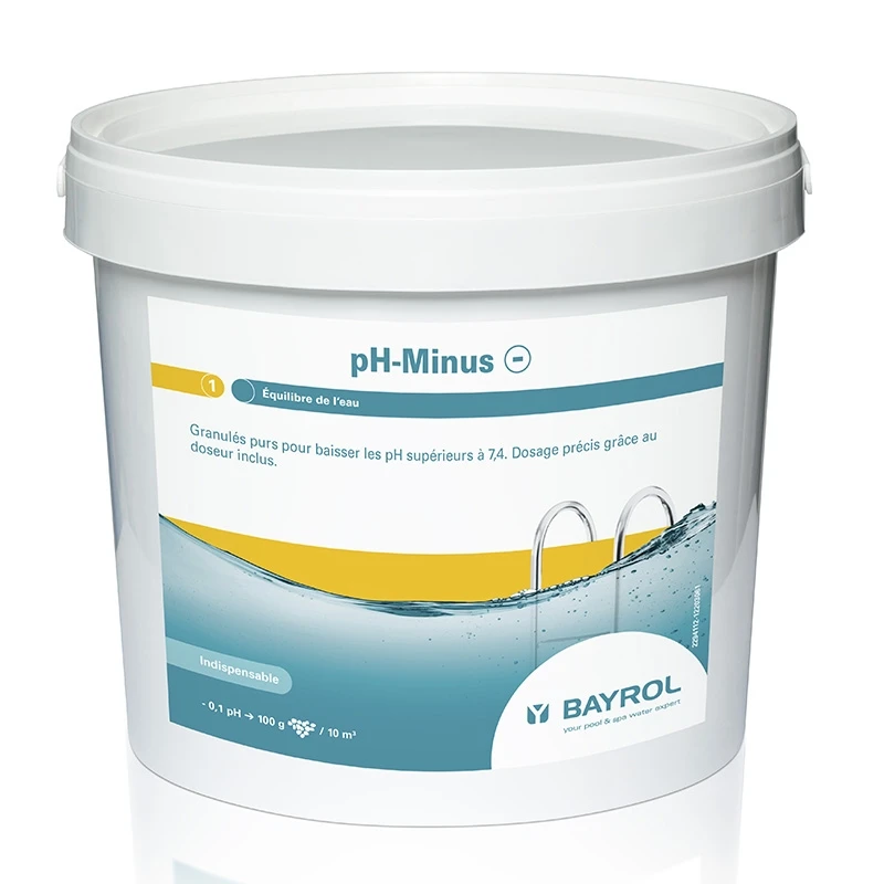 La régulation du pH est la clé du traitement de l’eau de votre piscine. Un pH mal ajusté risque de rendre inefficaces les produits de traitement que vous utilisez dans le bassin et pourrait représenter une perte importante de temps et d’argent. Il est donc conseillé de vérifier votre pH chaque semaine et s’il est trop haut (supérieur à 7,4) il vous faut le baisser à l’aide du pH minus de Bayrol.