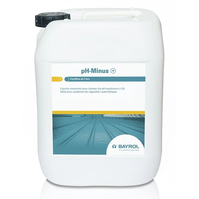 Le pH minus liquide de Bayrol se présente sous la forme d’un bidon permettant à votre système de régulation pH de réaliser l’injection directement depuis cet emballage.